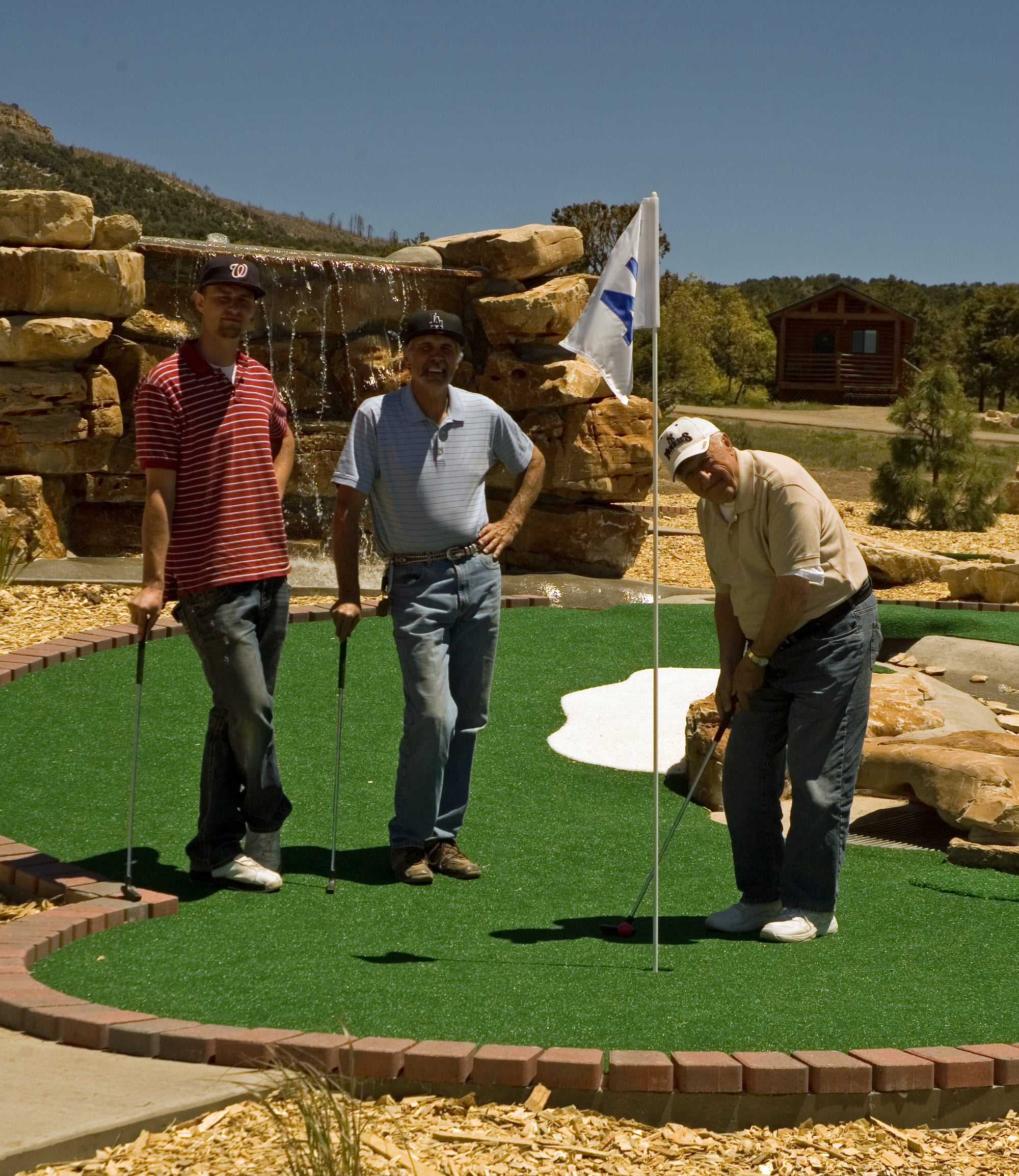 Last weekend the weather cooperated with us as we were able to complete the golf course, which opened for guests on Saturday.  By the afternoon we had quite a few groups of children, families, and adults playing 18 holes.  Our course has it all – a creek, bridges, inclines, a waterfall, and lots of twists and turns.  You’ll also see both smiles and serious faces.