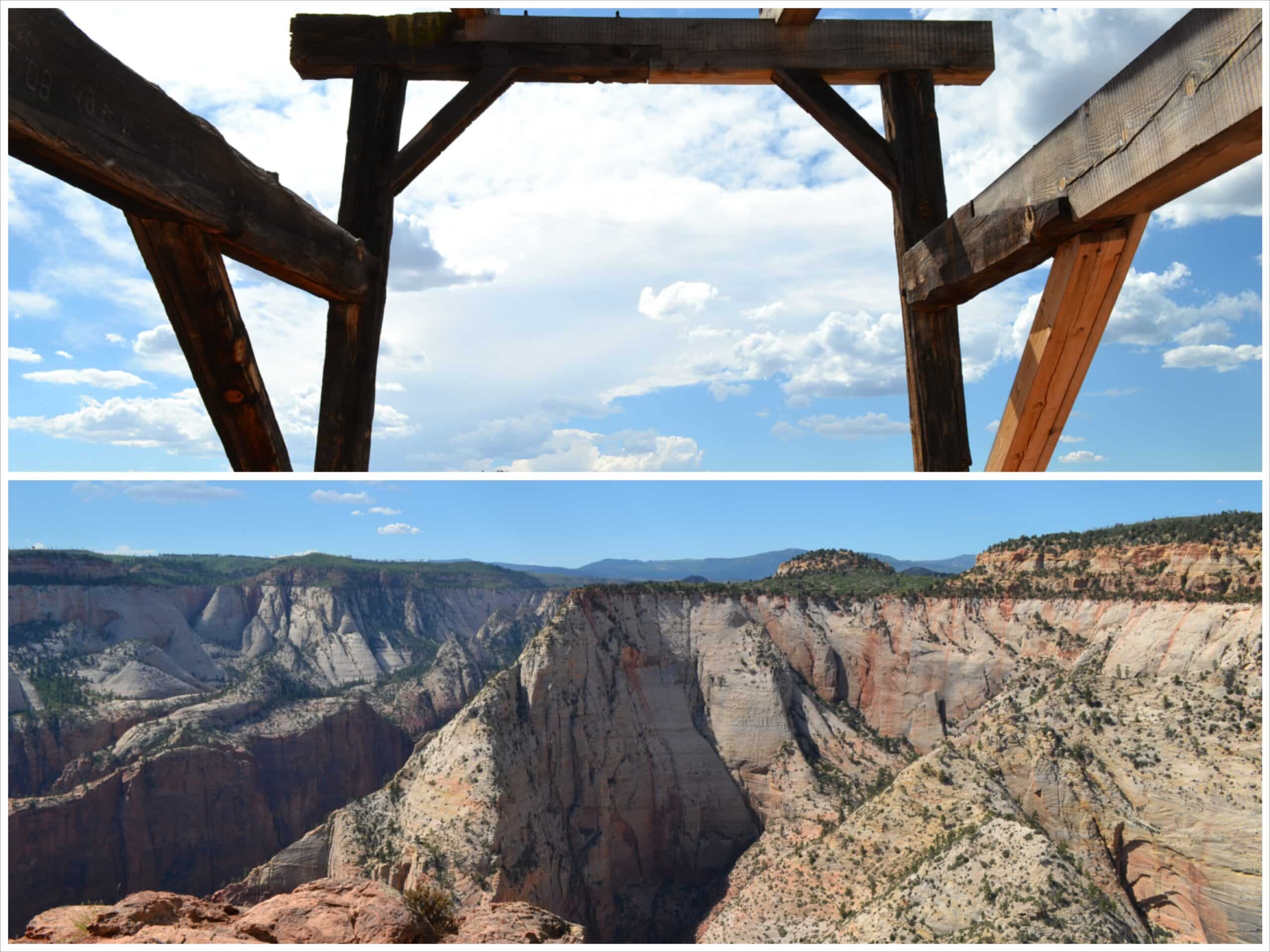 Why such historic notoriety? Mormon leader Brigham Young predicted in 1863 that some day lumber would be moved “as the hawk flies” from Cable Mountain. In 1901 his prophesy was fulfilled by David Flanigan , a Springdale pioneer, who engineered the cableworks that lowered lumber 2,000+ feet to the canyon floor below in two minutes. A wagon trip to transport the same load would have taken three days—sometimes up to 10 days round trip. The wood mechanism was nearly destroyed by a lightening fire in 1911, and again in the 1920s but was rebuilt each time because the method was so efficient.